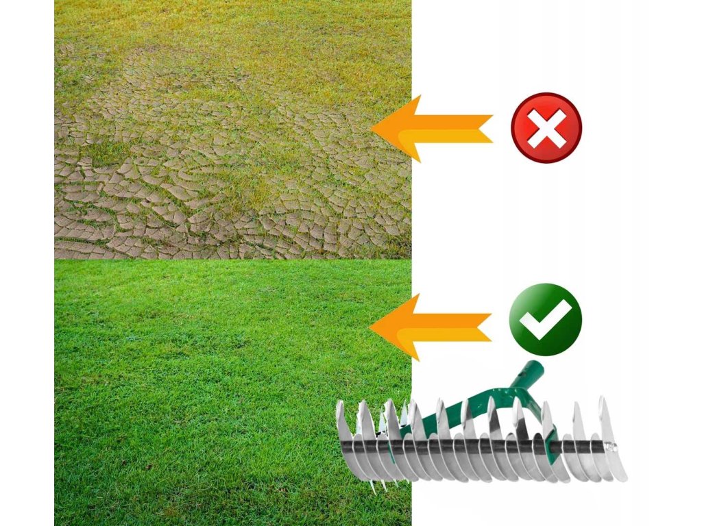 Този ефективен ръчен скарификатор аерира почвата и по този начин подобрява растежа на тревата. В допълнение, той разрохква и нежно коси тревата, позволявайки й да използва по-добре хранителните вещества и водата от почвата.