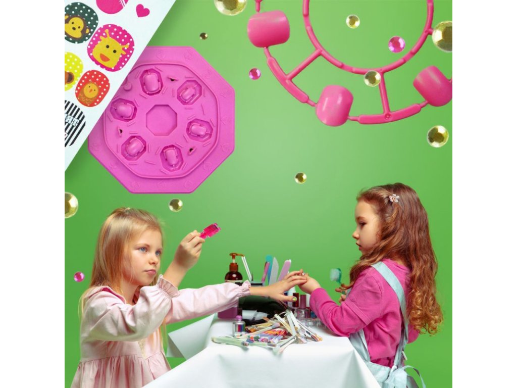 Насладете се на часове забавление с това креативно детско студио за нокти. Страхотният комплект съдържа всичко необходимо за професионална подготовка на вашия маникюр и педикюр. Малките момиченца ще се почувстват като млади дами и заедно с приятелите си ще създадат атмосфера като в салон.