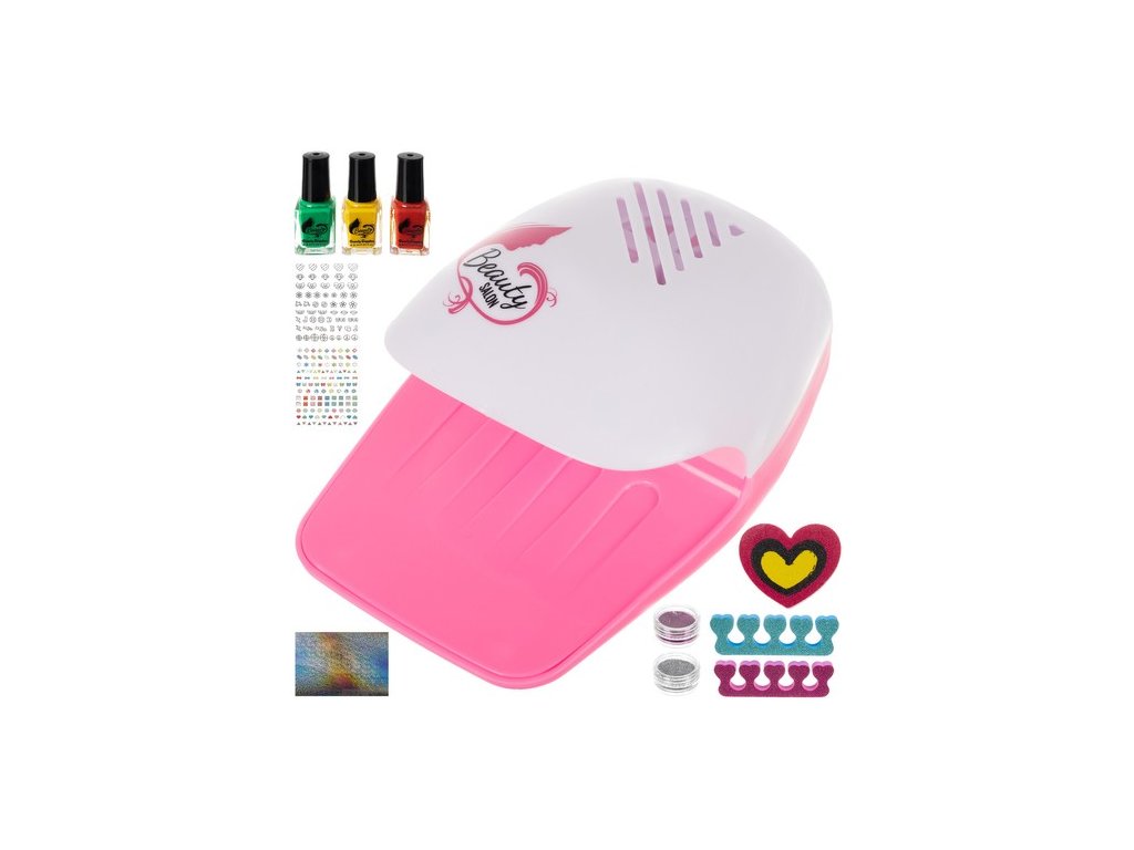 Детският комплект за ноктопластика е напълно оборудван с всичко необходимо за грижа за ноктите. Съдържа сешоар, с който лакът изсъхва по-бързо, лаковете блестят с наситени цветове, а за най-перфектен резултат комплектът ви предлага различни глитъри и стикери за декорация.