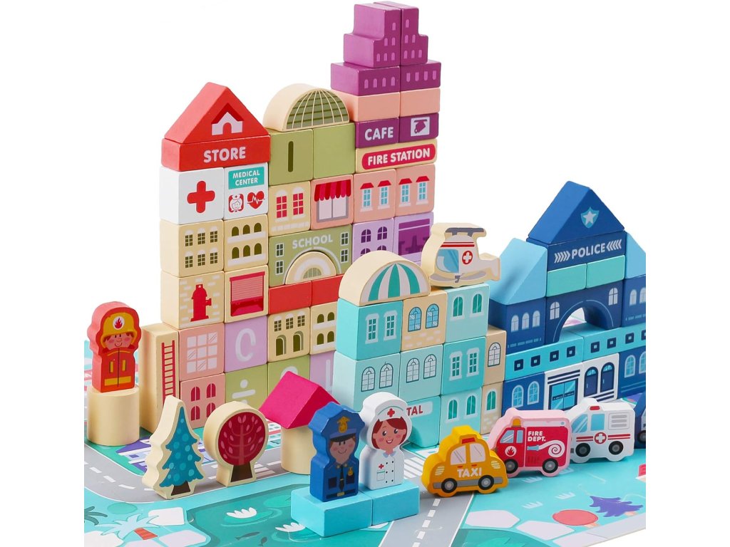 Подарете на децата си незабравими изживявания, пълни с креативност и образование чрез уникалния дървен град 3 в 1 блокчета.