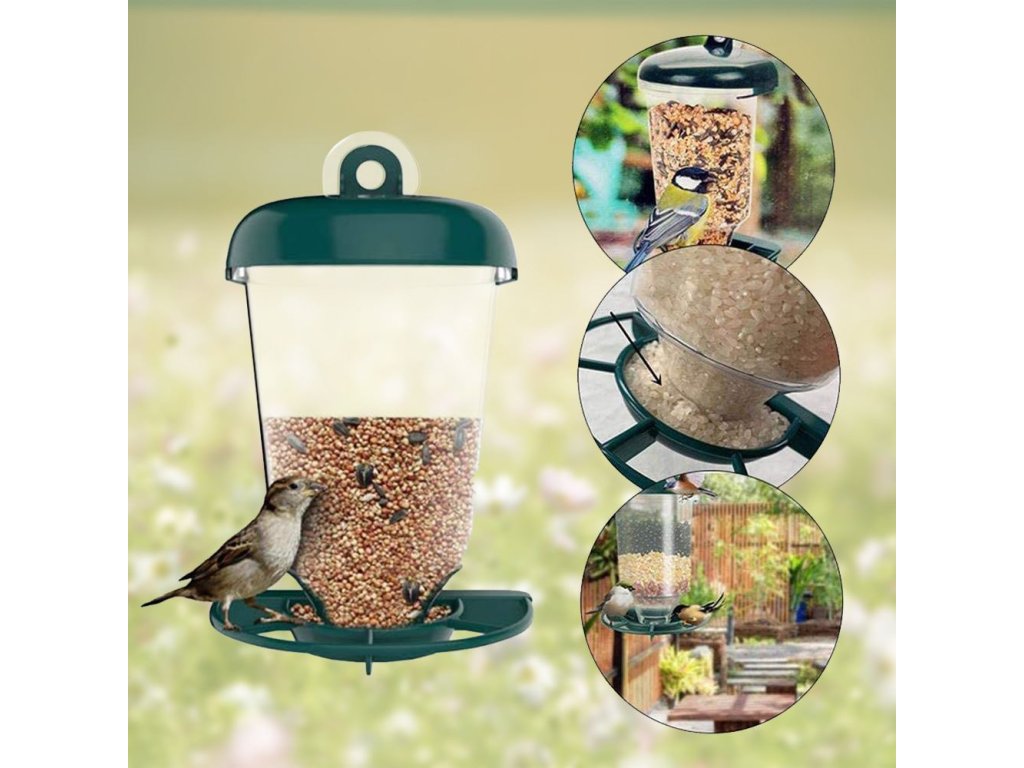 Голямо предимство на тази хранилка е достатъчният резервоар, в който можете да насипете храна за птици. Той автоматично се попълва при необходимост чрез самоотпадане. По този начин не е нужно да се притеснявате, че сте забравили да добавите фураж и вашите птици ще гладуват през зимата.