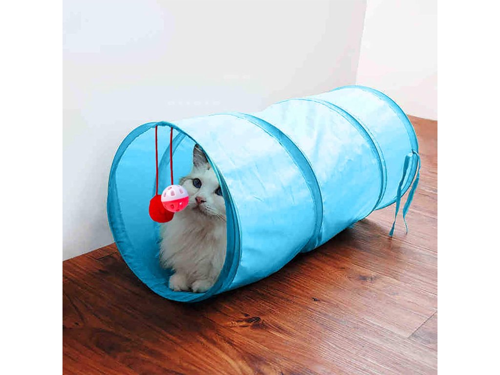 Сгъваем тунел за котки е истинското забавление за вашите котки. На тунелите са окачени 2 играчки, които ще заинтересуват любимците ви от пръв поглед. Няколко тунела също могат да бъдат вързани заедно с въжета, така че да създадете дълга рамка за катерене.
