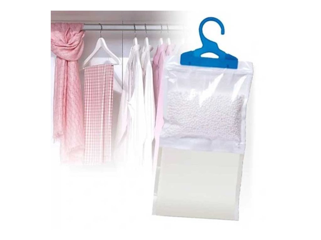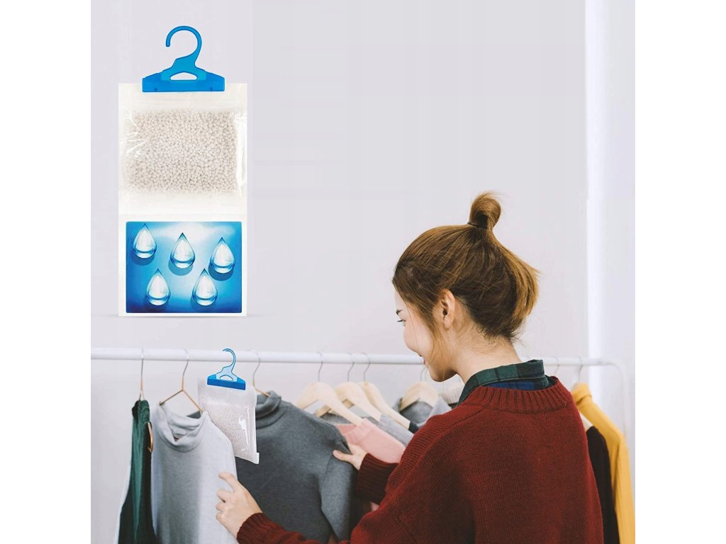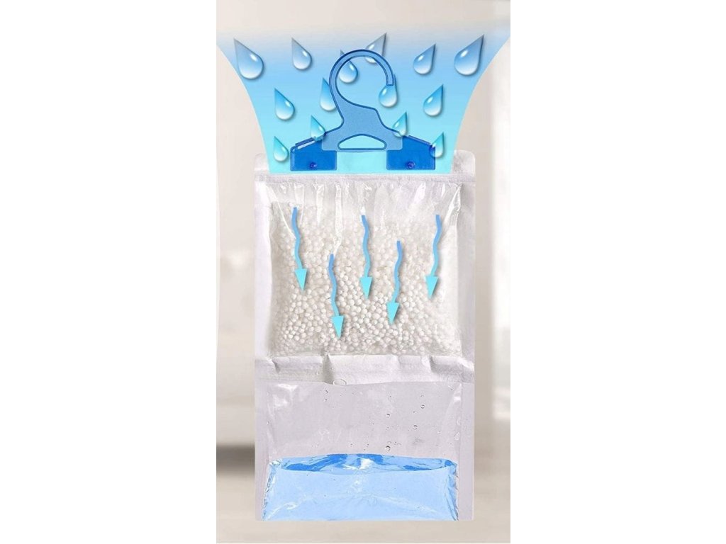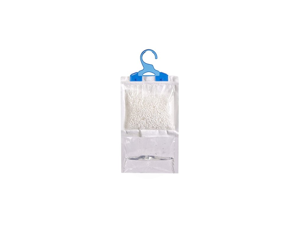 Влагоабсорбаторът се състои от две части. Първата, горна торба, съдържа частици калциев хлорид, който абсорбира излишната влага, която след това отделя във втората, долна част на абсорбера. Тук водата се събира и няма да капе на земята. Практичният дизайн с кука гарантира, че не заема почти никакво място в гардероба ви.