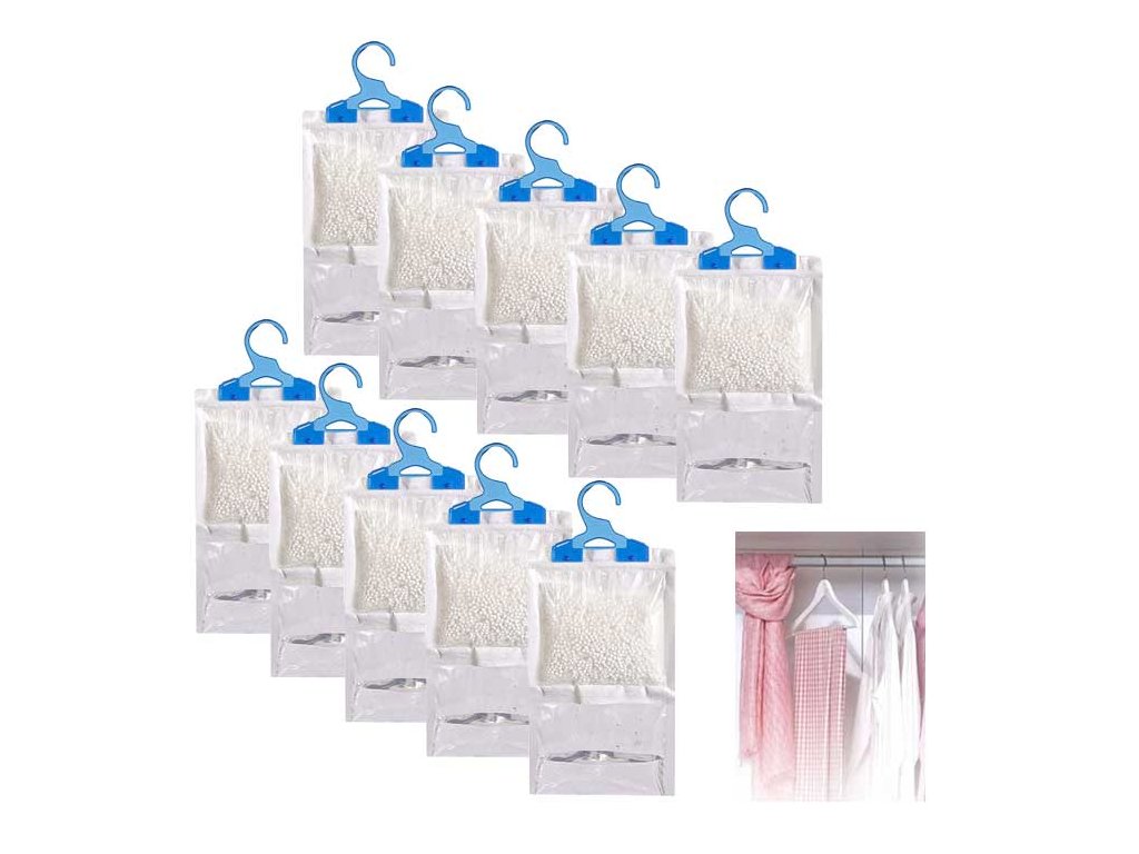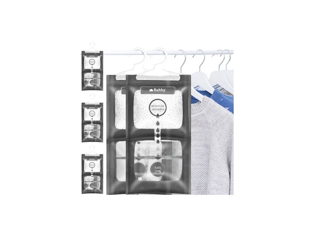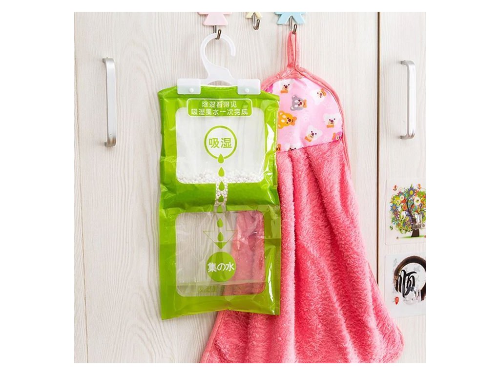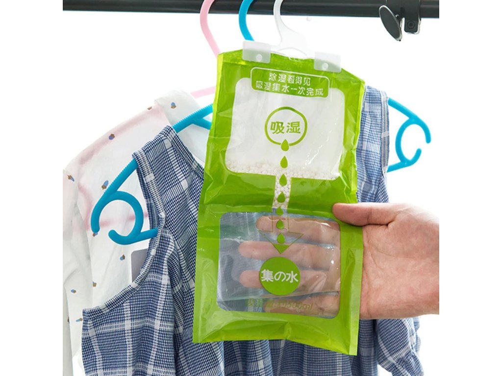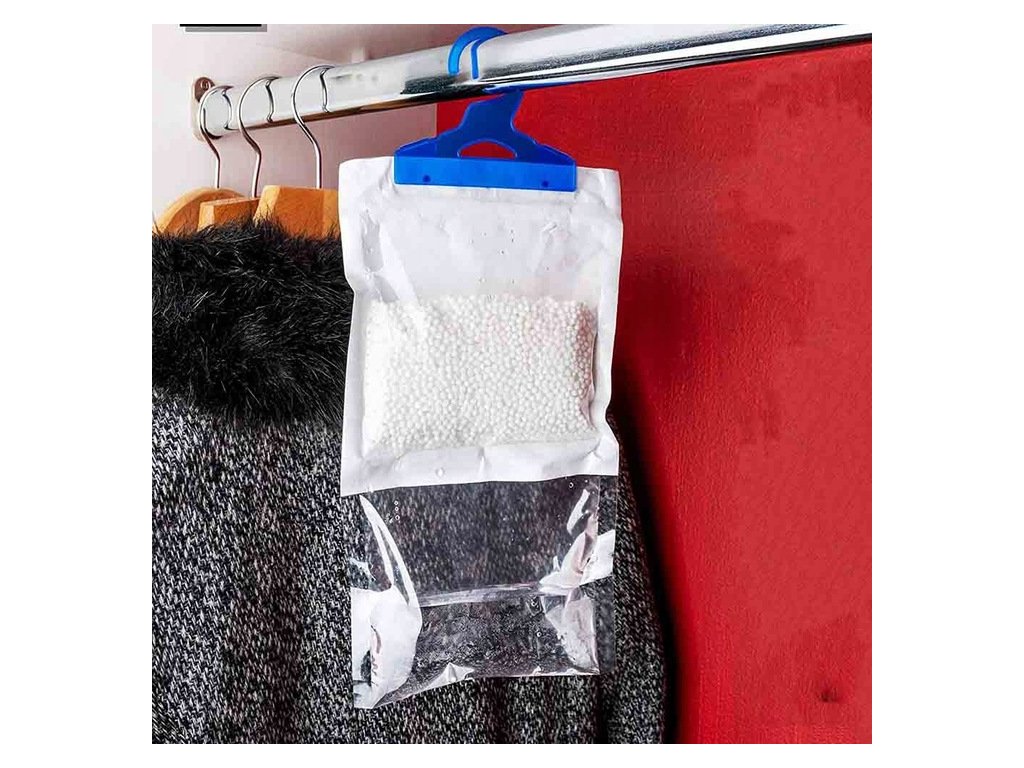 Влагоабсорбаторът се състои от две части. Първата, горна торба, съдържа частици калциев хлорид, който абсорбира излишната влага, която след това отделя във втората, долна част на абсорбера. Тук водата се събира и няма да капе на земята. Практичният дизайн с кука гарантира, че не заема почти никакво място в гардероба ви.