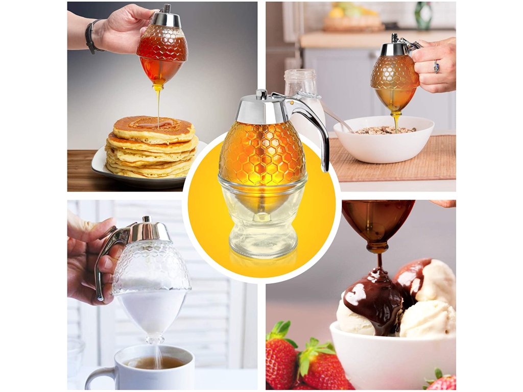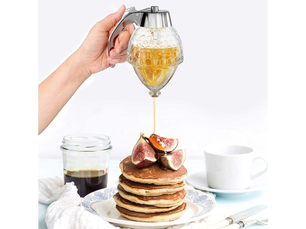 Забравете за неприятните разливи на мед, лепкавите петна и бъркотията. С този уникален дозатор можете да се поглезите с вашето лакомство веднага, удобно и без бъркотия. Можете също така да използвате дозатора за сироп, шоколад, захар и всичко друго. Просто натиснете лоста на дръжката и тя веднага ще потече отдолу. Пускаш лоста и веднага спира без никаква бъркотия.