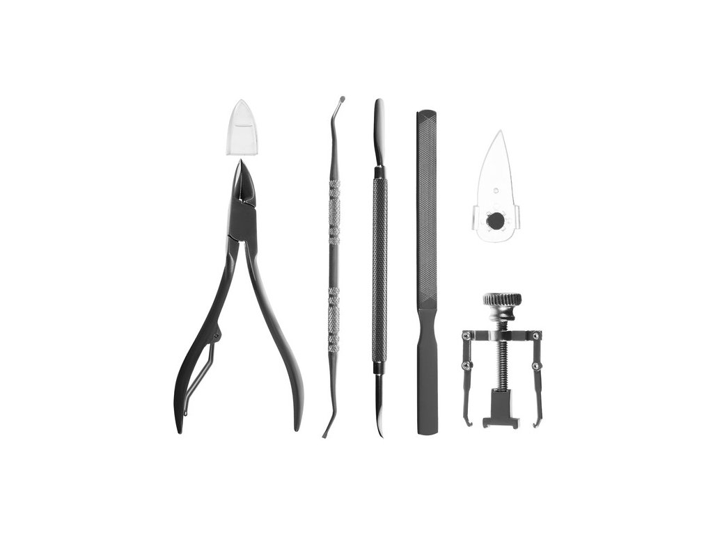- Съдържание на комплекта: повдигач за нокти, пила, коректор, пинсета, средство за премахване на кожички, защитен щит