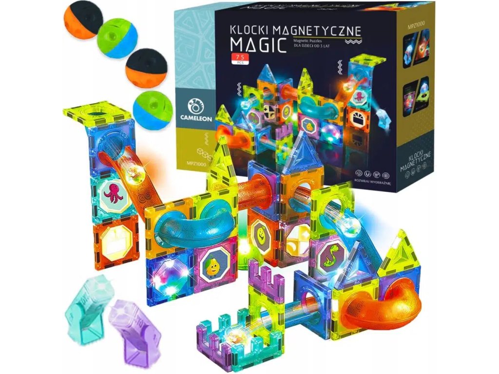 Пистата с магнитни топки трябва да има и осветление, което да осветява не само изградените творби, но и лицата на вашите деца. Комплектът за изграждане ви предлага до невероятните 75 елемента, с които ще се забавлявате безкрайно.
