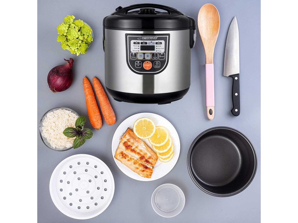 - Аксесоари: мерителна чаша, черпак за ориз, черпак за супа, кошница за пара