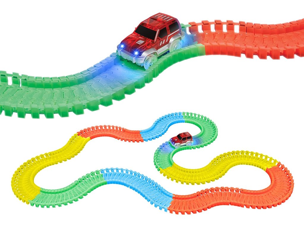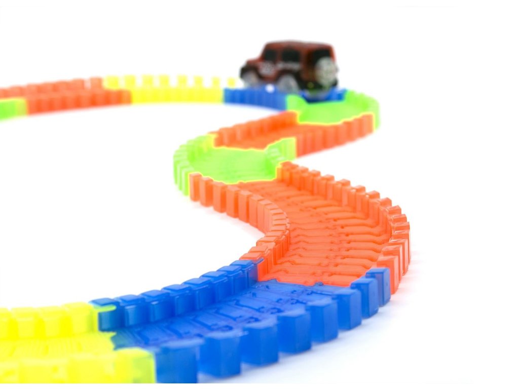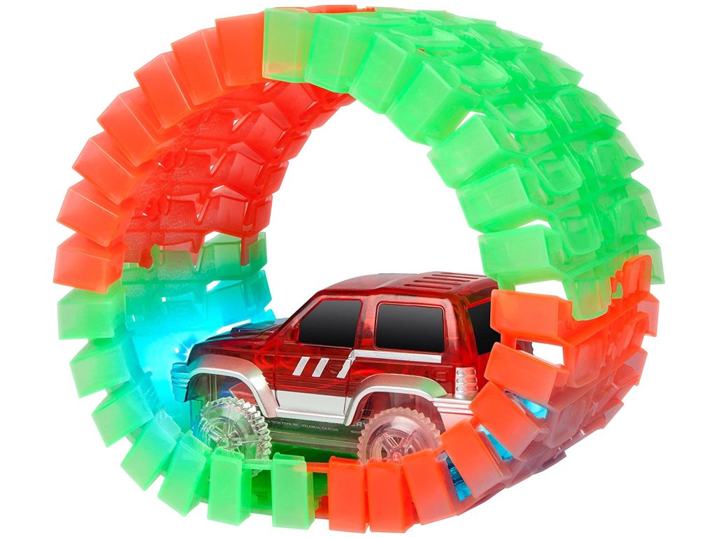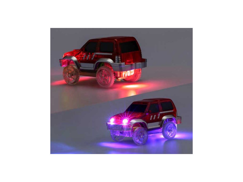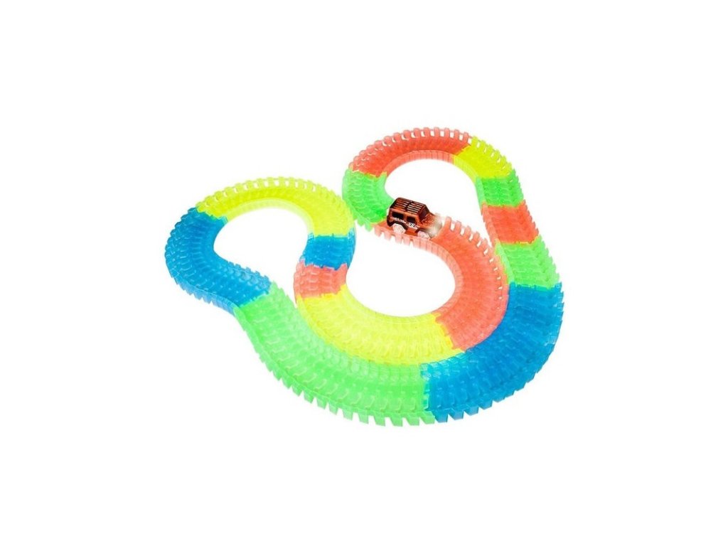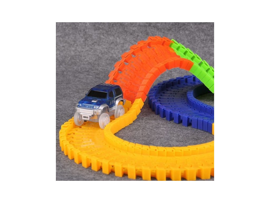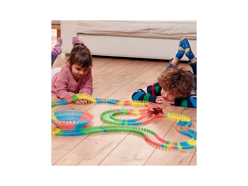 Пакетът включва специална кола играчка. В него поставяте 1x AA батерия. Всичко, което трябва да направите, е да включите колата играчка, да я пуснете на пистата и да се насладите на бързото й каране през всички капани, които сте подготвили за нея. Не сте доволни от безкрайните възможности за изграждане на писта и искате да изпитате нещо уникално? Изключете светлините и оставете автомобилната писта да свети из стаята, благодарение на флуоресцентния материал, от който е направена. Играта на цветовете се допълва от автомобила, който е оборудван със собствено LED осветление. Включвате го с бутон и просто се наслаждавате на красиво, бързо каране. Благодарение на включените стикери можете да го залепите.