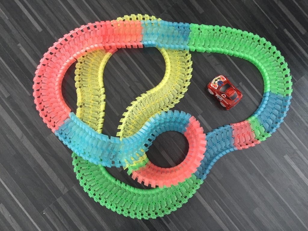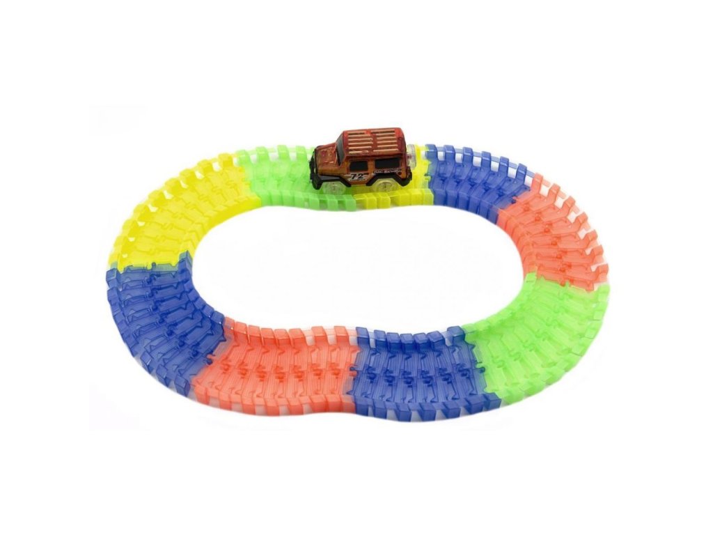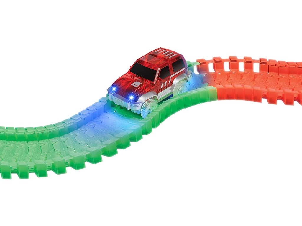 Пакетът включва специална кола играчка. В него поставяте 1x AA батерия. Всичко, което трябва да направите, е да включите колата играчка, да я пуснете на пистата и да се насладите на бързото й каране през всички капани, които сте подготвили за нея. Не сте доволни от безкрайните възможности за изграждане на писта и искате да изпитате нещо уникално? Изключете светлините и оставете автомобилната писта да свети из стаята, благодарение на флуоресцентния материал, от който е направена. Играта на цветовете се допълва от автомобила, който е оборудван със собствено LED осветление. Включвате го с бутон и просто се наслаждавате на красиво, бързо каране. Благодарение на включените стикери можете да го залепите.